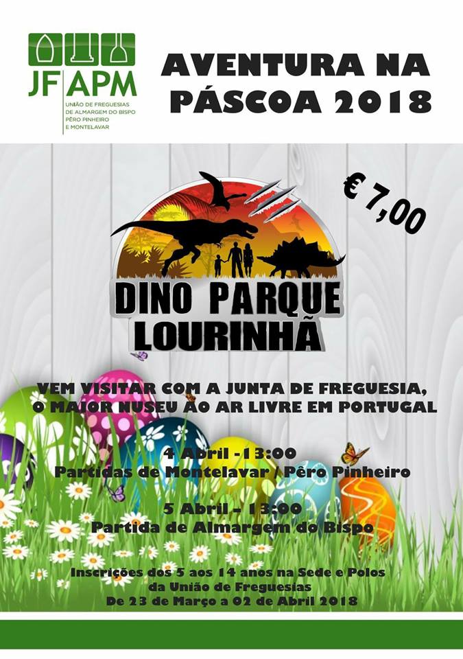 No âmbito deste projecto vamos levar as crianças a visitar o Dino Parque, maior Museu ao ar livre em Portugal, no dia 04/04/2018 para crianças de Montelavar e Pêro Pinheiro e no dia 05/04/2018 para crianças de Almargem do Bispo.